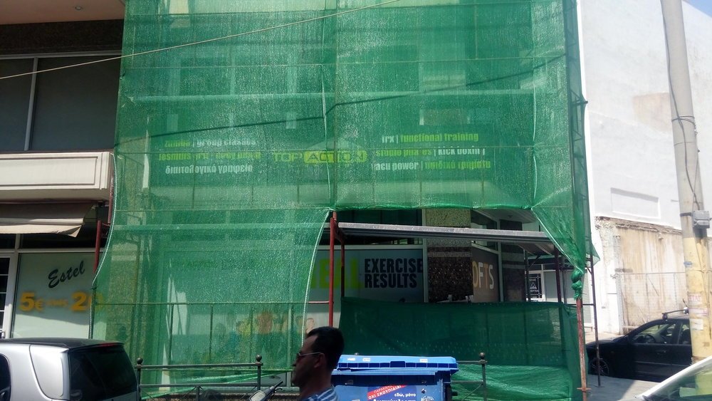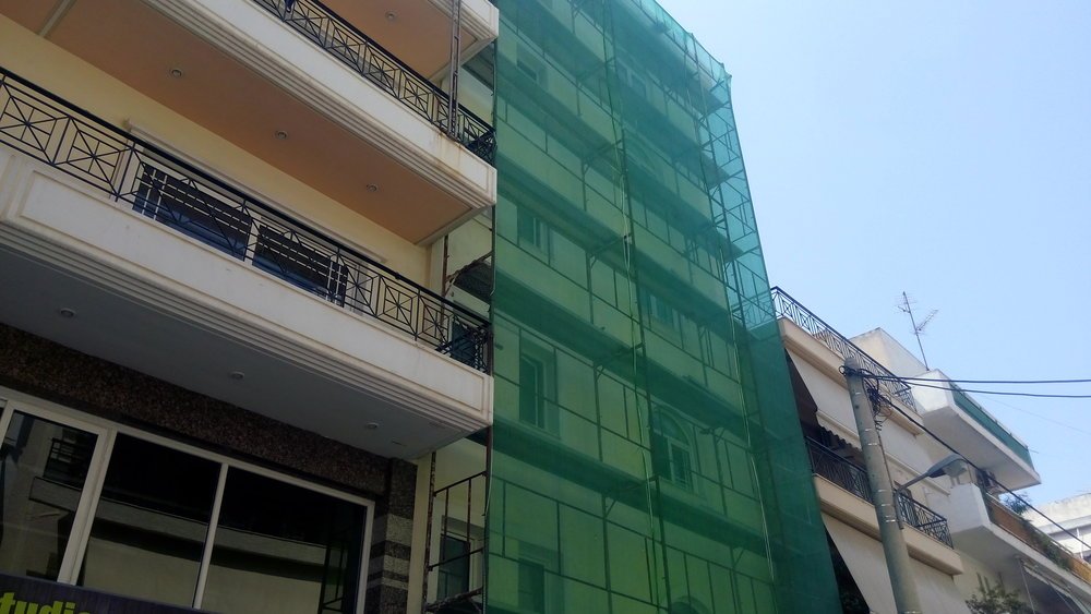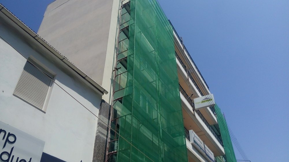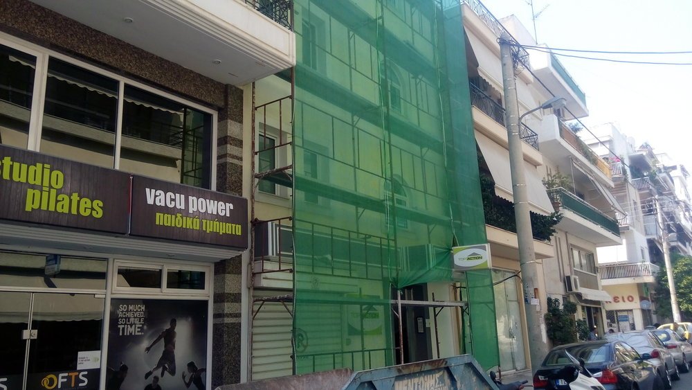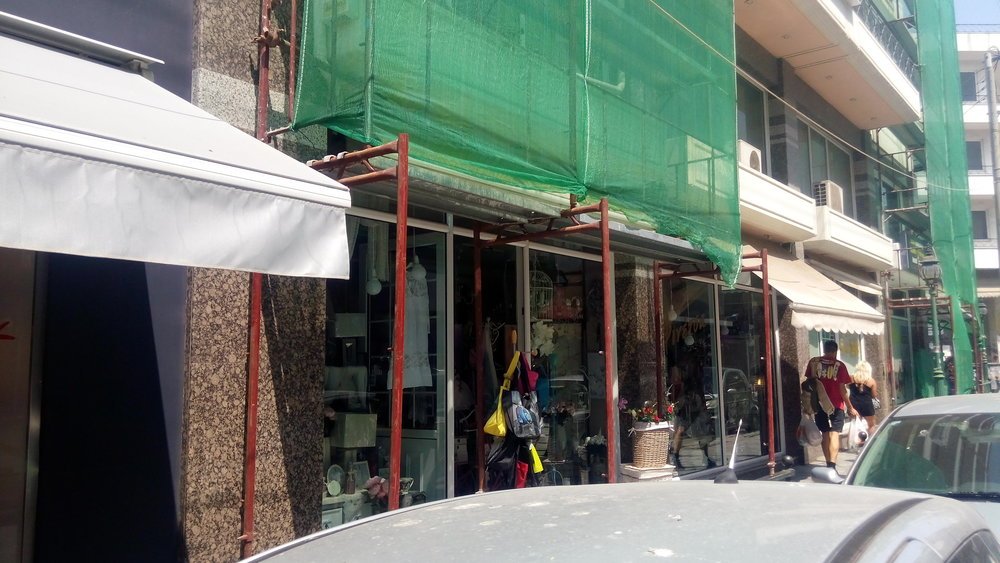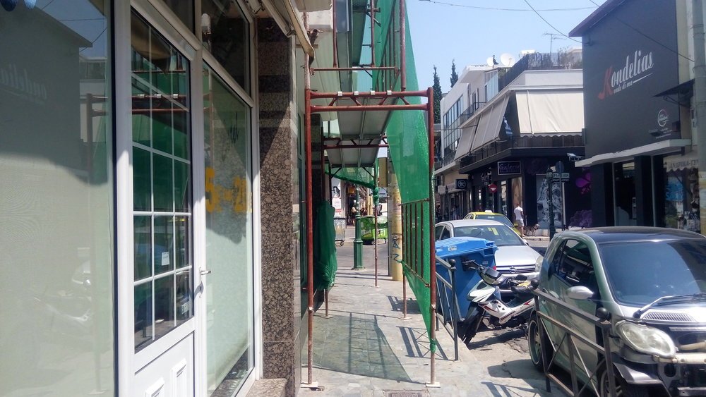 Σκαλωσιά σε κτήριο τριών όψεων με διασφάλιση της λειτουργίας των καταστημάτων στο ισόγειο και την ασφαλή διάβαση των πεζών.