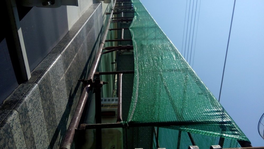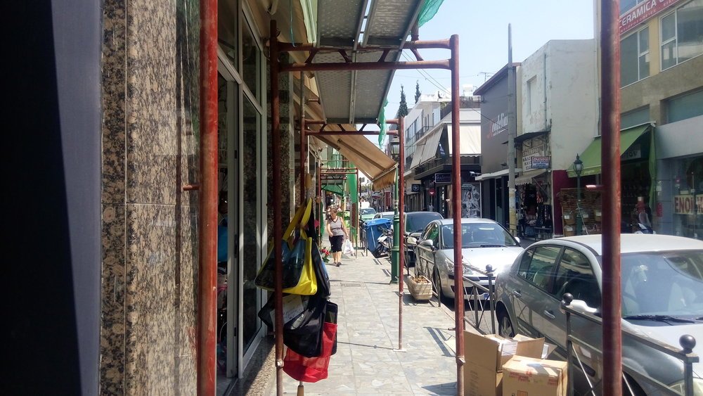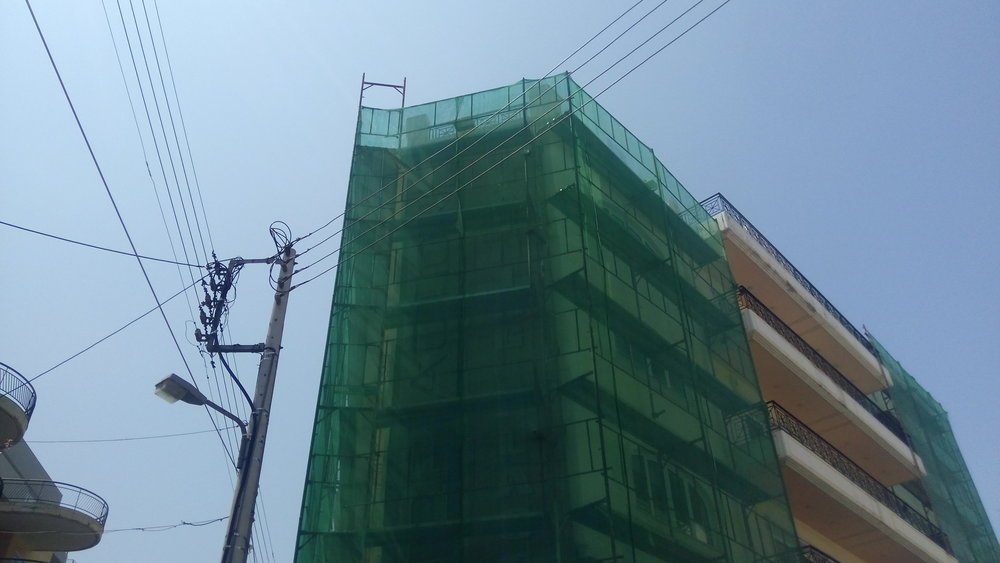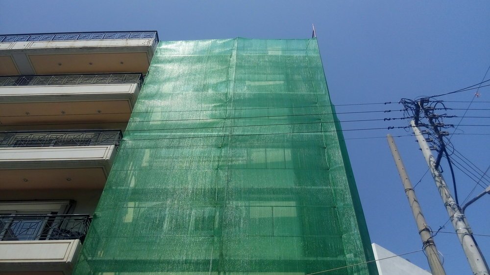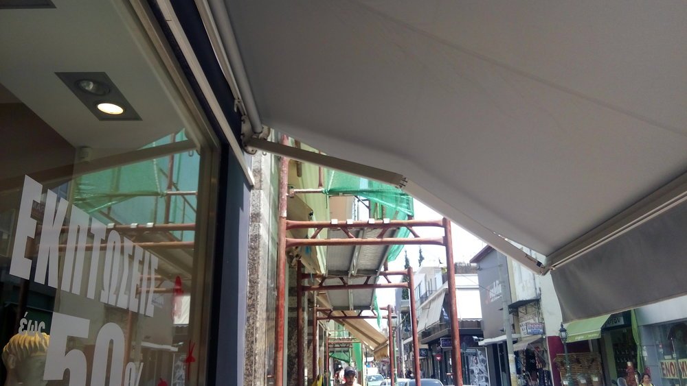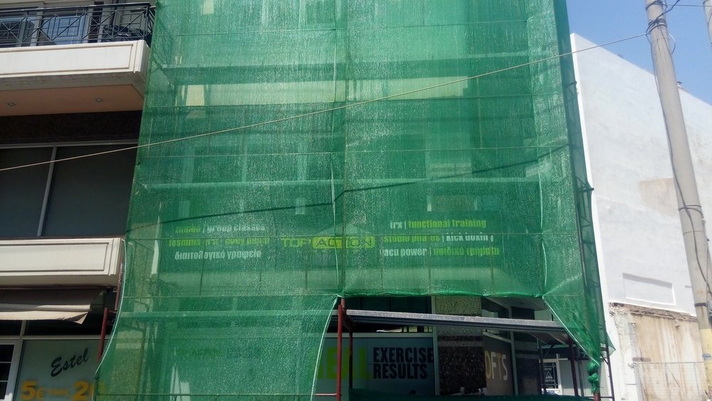 Σκαλωσιά σε κτήριο τριών όψεων με διασφάλιση της λειτουργίας των καταστημάτων στο ισόγειο και την ασφαλή διάβαση των πεζών.