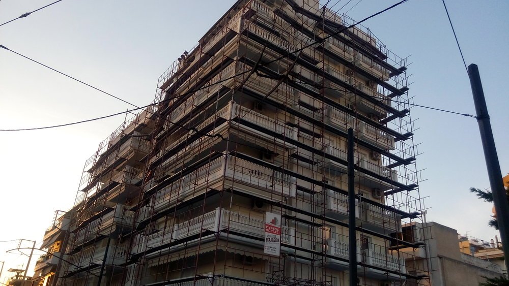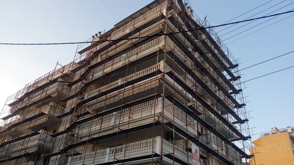 Τοποθέτηση σκαλωσιάς σε οκταόροφη πολυκατοικία στην Δραπετσώνα.