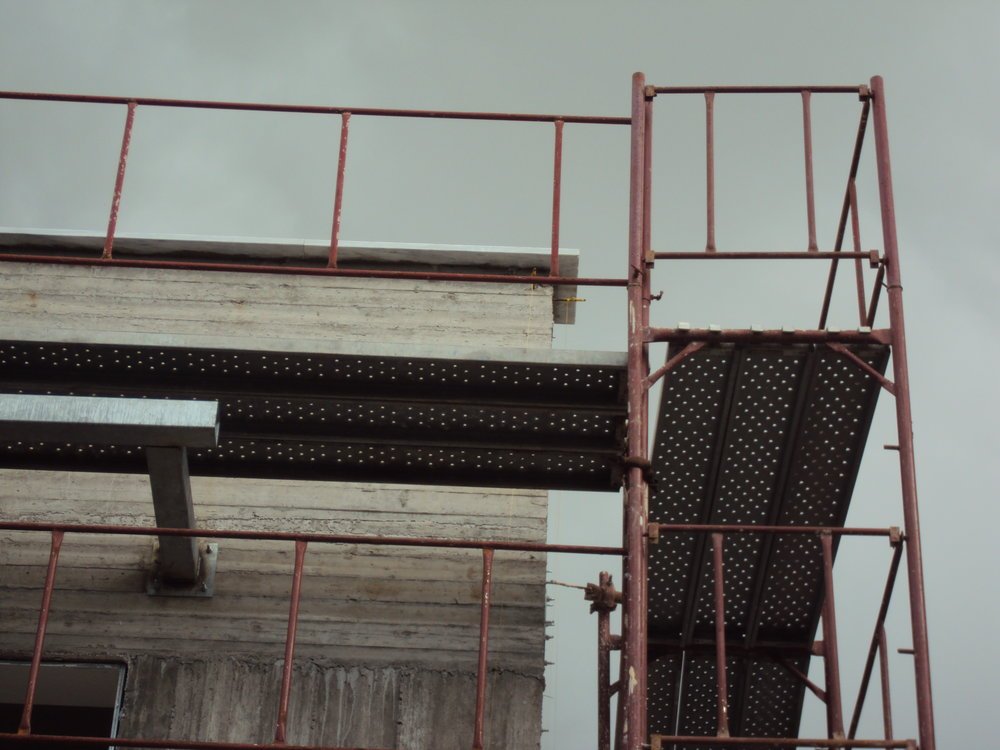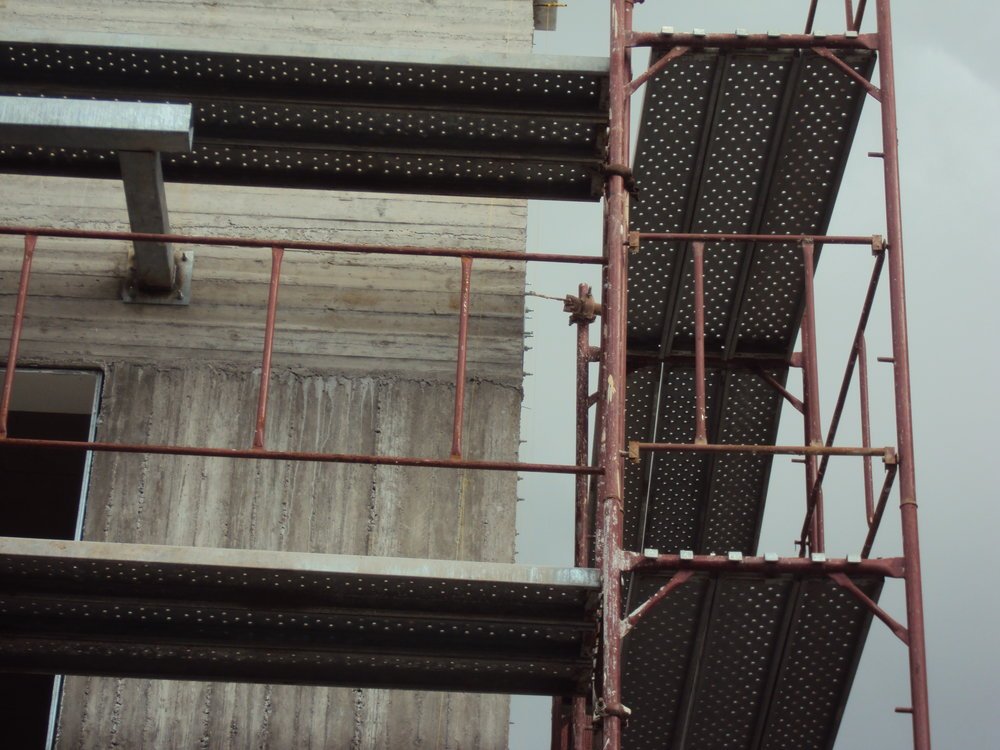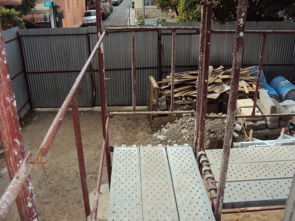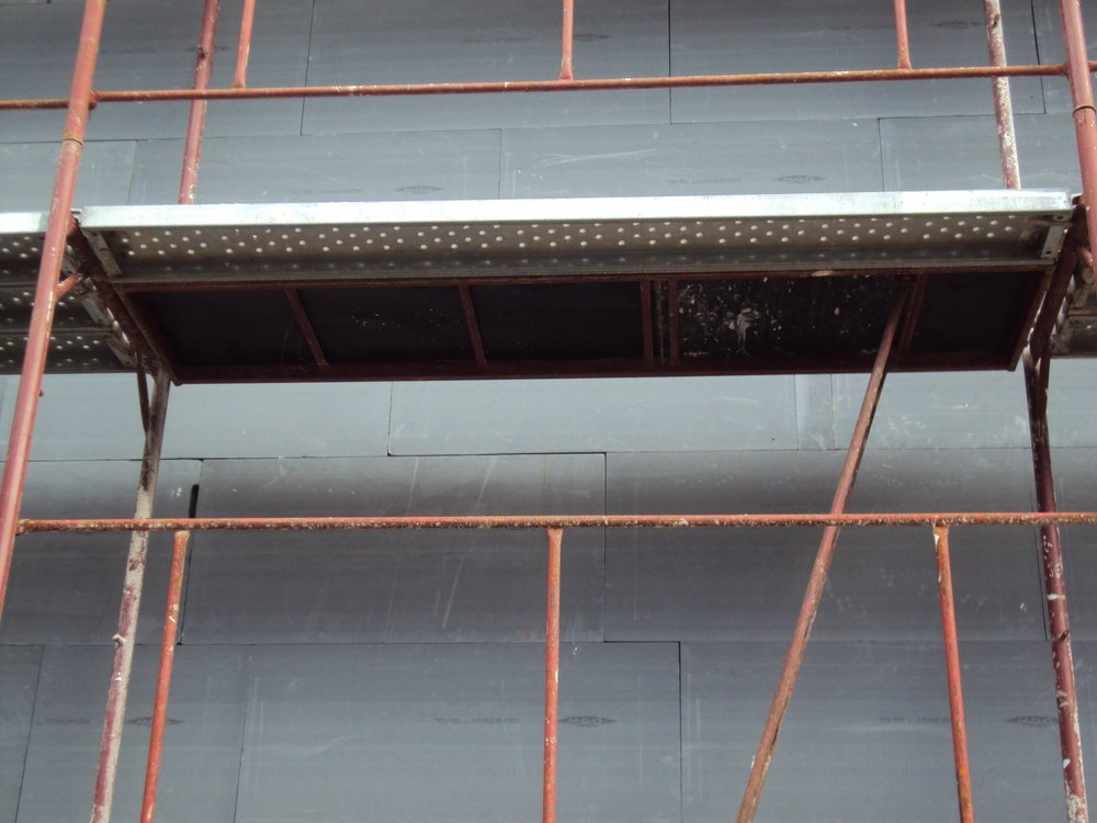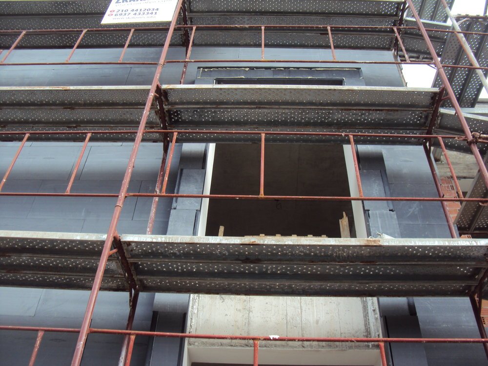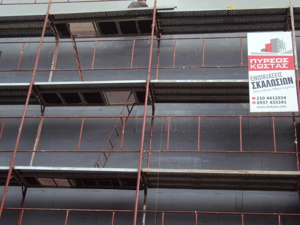 Σκαλωσιά σε σχολείο για τοποθέτηση θερμοπρόσοψης με ειδικά βύσματα απόστασης 25 πόντων για την αποφυγή τραυματισμού της μόνωσης.
